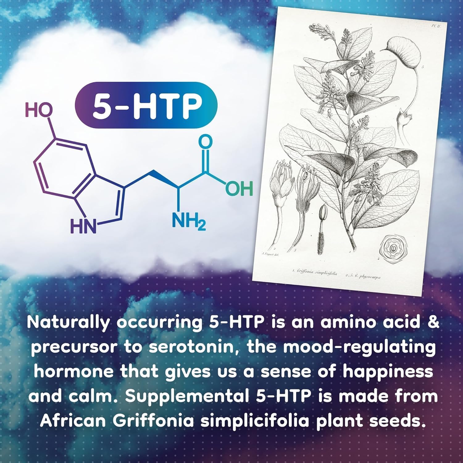 5-HTP (5-Hydroxytryptophan) is an amino acid found in nature (commonly extracted from Griffonia simplicifolia seeds) that supports serotonin production. Balanced serotonin affects mood, pain sensitivity, digestion, and sleep.
