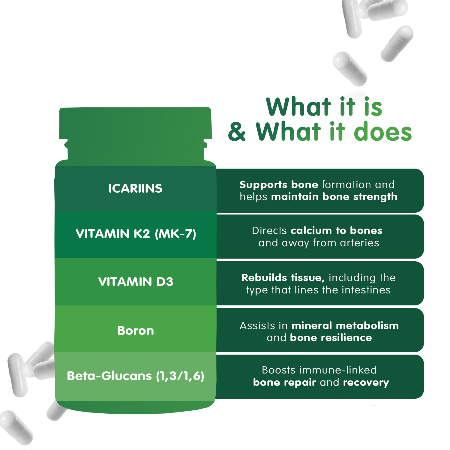 ✔ Beta-Glucans (1,3/1,6) – Boosts immune function for skeletal health